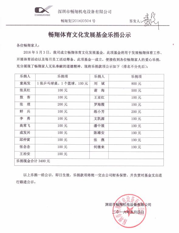 暢翔體育文化發(fā)展基金樂捐公示